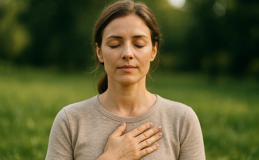 Übung: Setz dich kurz hin, schließe die Augen und geh mit der Aufmerksamkeit ins Herz. Sag dir innerlich: „Ich beobachte nur. Ich bin nicht meine Gedanken.“