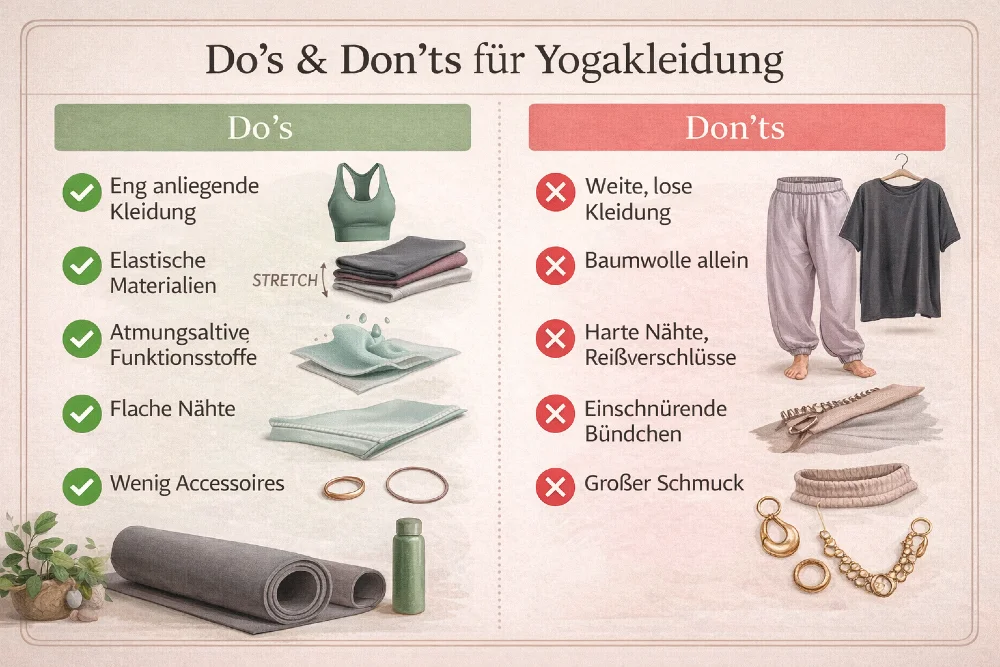 - Häufige Fehler: Zu weite Kleidung, reine Baumwolle und Schmuck lenken ab und stören die Praxis.