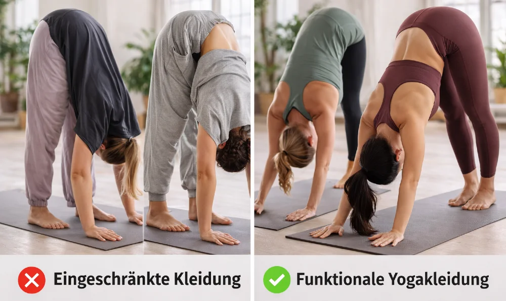 Jogginghosen wirken gemütlich, bringen aber Nachteile mit sich. Sie können an den Beinen rutschen, sich in den Kniekehlen stauen oder bei Drehungen ein Eigenleben entwickeln. In ruhigen, bodennahen Yogastilen mag das noch funktionieren, in dynamischeren Stunden wird es schnell unpraktisch.