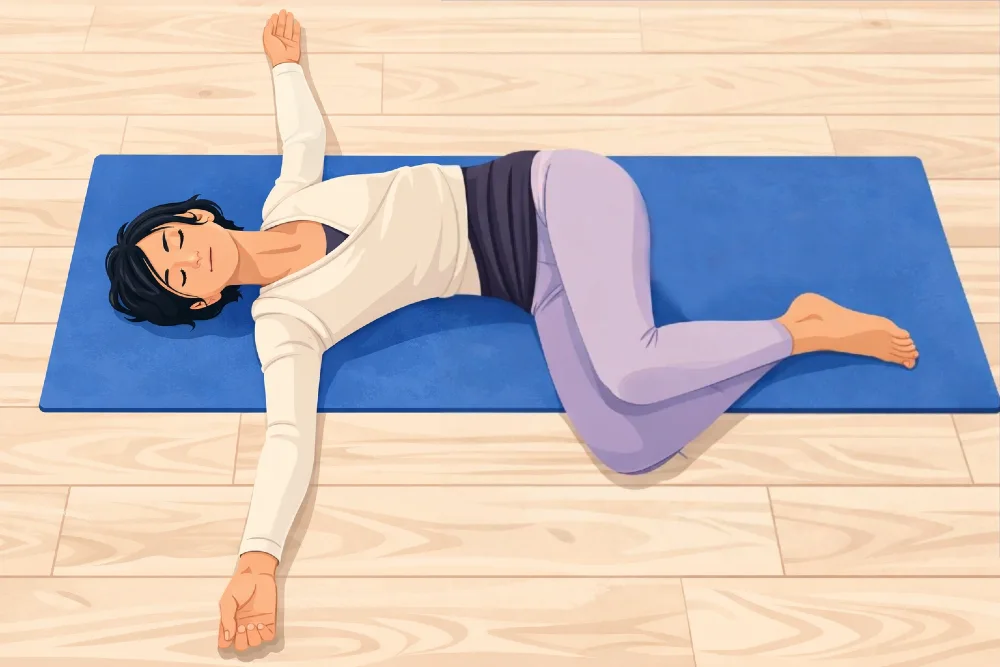 - Senke mit der nächsten Ausatmung deine Knie nach rechts ab. Halte die Beine zusammen, sodass diese in der Endstellung übereinander liegen.
